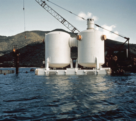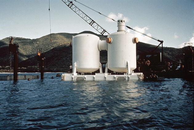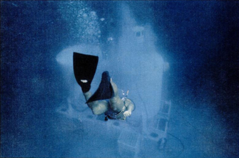 - 在美属维尔京群岛圣约翰的大拉姆舒尔湾附近,Tektite I与潜水员和随行潜水员一起拍摄的水下照片。(资料来源:Seabee杂志,图片来源:NOAA)